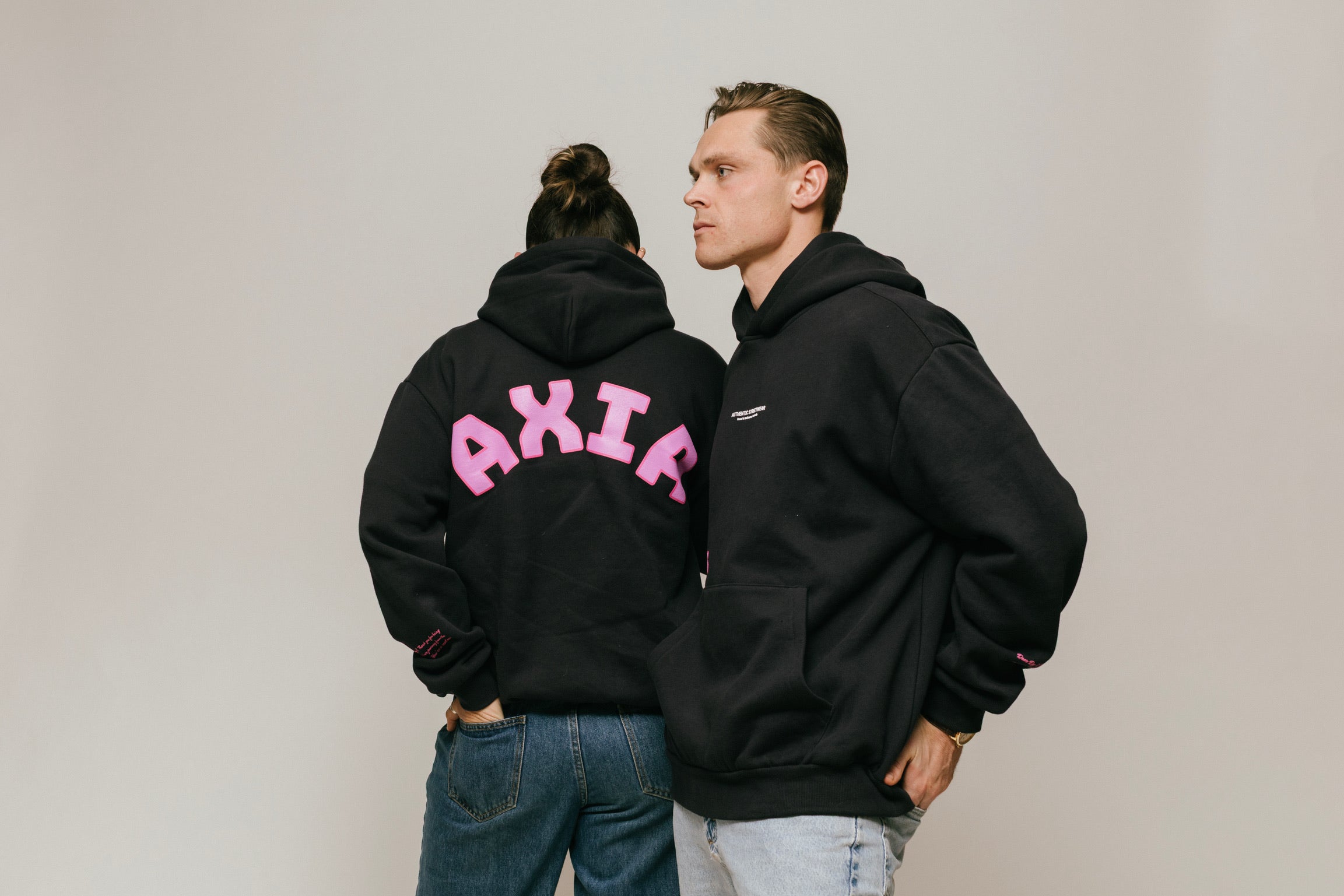 Mickey is 5'9 (182cm) wearing a Large and Mia is 5'10 (185cm) wearing a Medium.